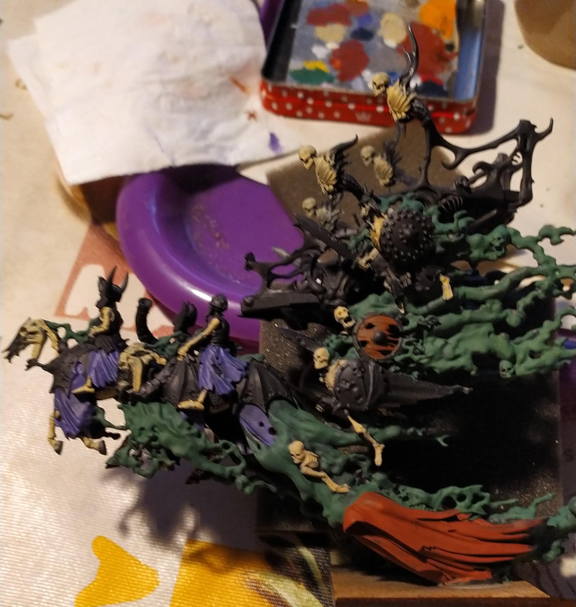 La primera semana de Abril se centró en dar las capas bases, como había decidido no hacerlo fantasmal, pintaría los esqueletos de hueso (solo aquellos que estén parcialmente materializados), los ropajes de los "Revenants a caballo" irían en morado por ser élite, los esqueletos normales de cualquier color, y los espectros de rojo como en el resto de mi ejército.
